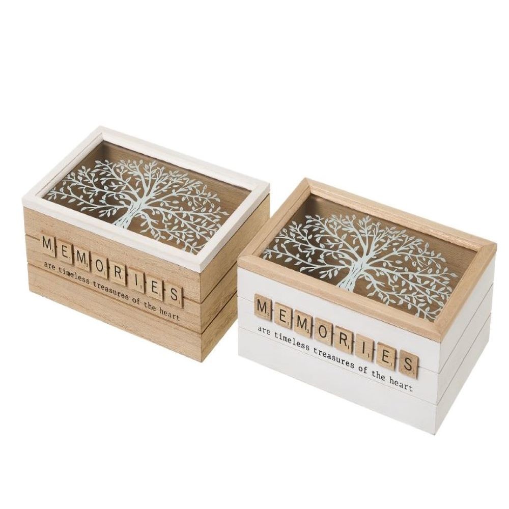 Caja de madera rectangular. Tapa transparente con silueta blanca de árbol. Incluye mensaje en la parte delantera: Memories: are timless treasures...