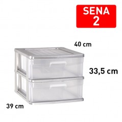 Cajonera de plástico transparente con detalles en plata. Compuesta por 2 cajones.