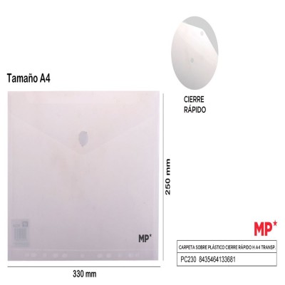 Carpeta en forma de sobre transparente de plástico con cierre rápido.