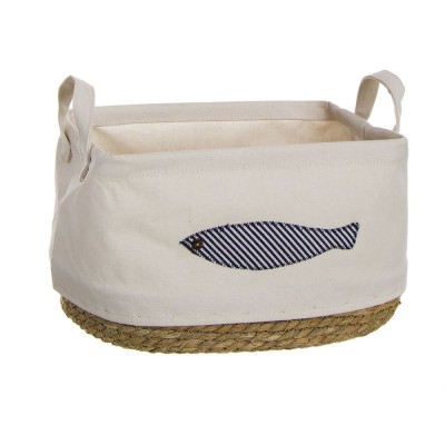 Cesta blanco con bordado de pez azul en la parte delantera. Base estilo mimbre. Diferentes tamaños disponibles.