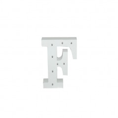 Letra F de madera de color blanco con luces LED.