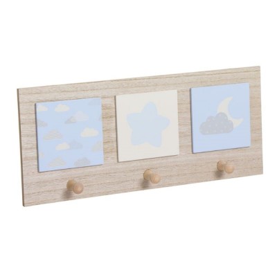 Perchero de madera con detalles en azul y amarillo pastel. Perchero formado por 3 colgadores con dibujo de nubes, estrella o luna en la parte superior de cada colgador. Dos modelos disponibles.