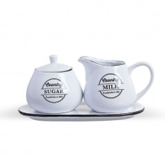 Juego de lechera y azucarero con plato alargado. Juego de color blanco con detalle circular en negro en la parte cental. Colección disponible.