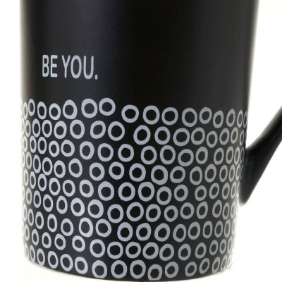 Taza negra mate con detalle de circulos blancos y texto "Be you". Cuatro modelos y dos colores disponibles.