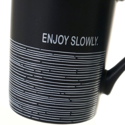 Taza negra mate con detalle de línea horizontales blancas y texto "Enjoy slowly". Cuatro modelos y dos colores disponibles.