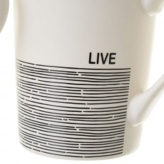 Taza blanca mate con detalle de líneas horizontales blancas y texto "Live". Cuatro modelos y dos colores disponibles.