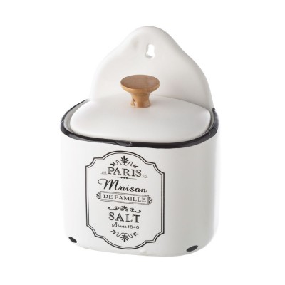Salero de color blanco con detalles en negro en la parte delantera central. Incluye un texto que pone "Paris, Maison de famille, Salt, since 1840". Colección disponible.