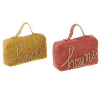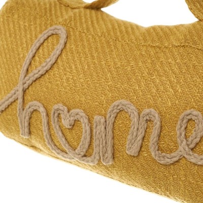 Sujetapuertas en forma de maleta de viaje. Color amarillo con bordado de HOME en marrón en la parte delantera.