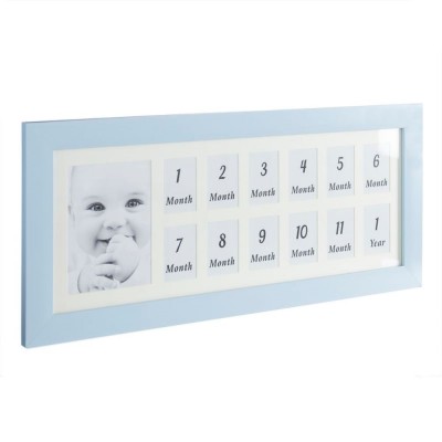 Portafotos múltiple que puede incluir doce fotos, una por mes. Portafotos de color azul con detalles en blanco.