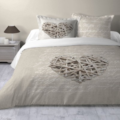 Características: Funda nórdica, medida 269x240CM + 2 fundas de 63X63CM, color beige con estampado de letras y corazón, material: 100% algodón