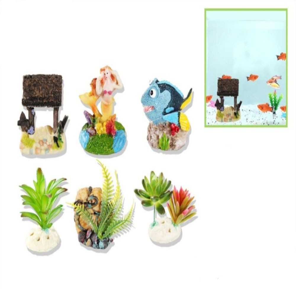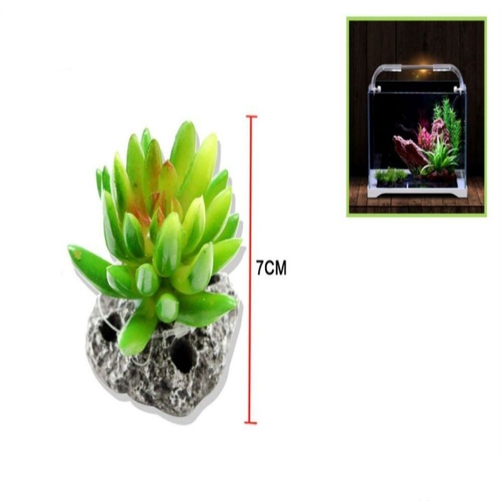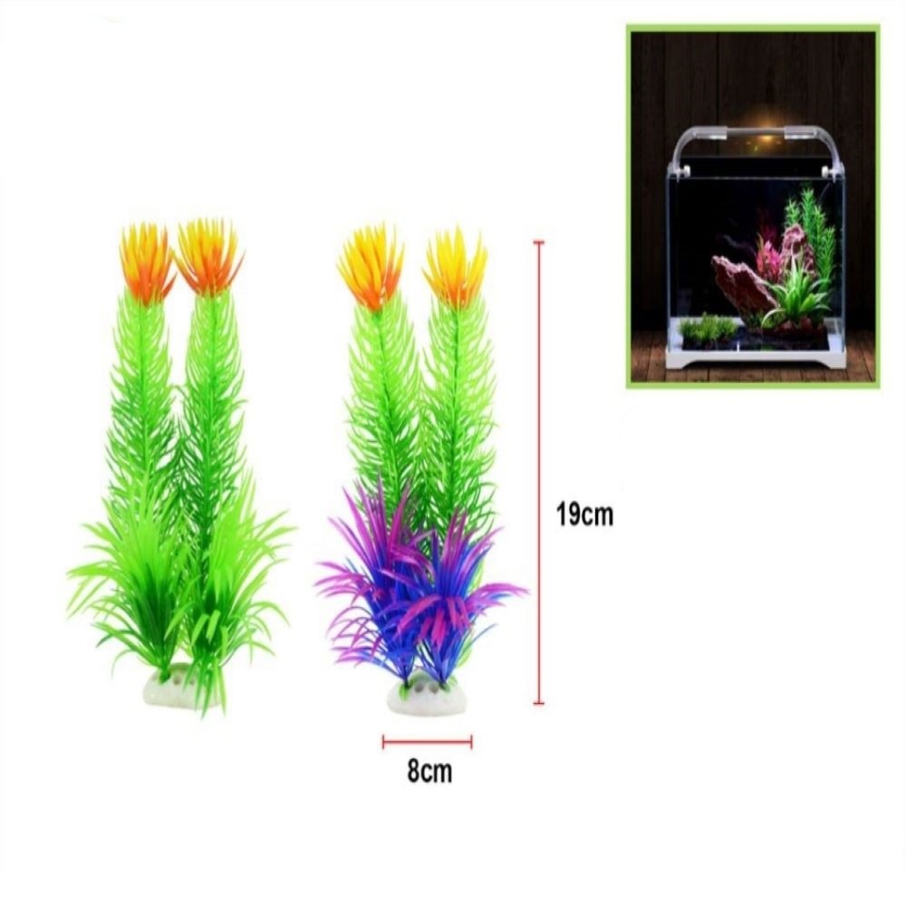 Aquarium ornament formed by a stone base, two small plastic plants and two figures that simulate two elongated green trees with orange detail on...
