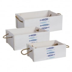 White wooden box with blue fish detail on the front and wicker-style handles.