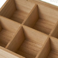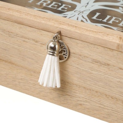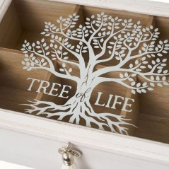 Wooden box with transparent lid. Includes a white tree silhouette on the cover with "Tree of life" text. The box is made up of six divisions and a tree of life detail on the front.