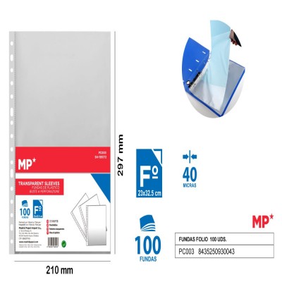 Pack of 100 units of 40 micron A4 folio sleeves.