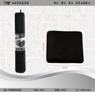 Black bath mat with hexagon-shaped reliefs.
