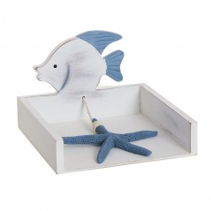 White wooden napkin holder with a star-shaped detail that serves to hold the napkins. Includes detail on the base in the shape of a fish or boat.