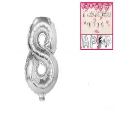 Foil balloon in the shape of a number 8 of silver color. Resistant and reusable, suitable for air, stickers and self-closing included. Different sizes available.