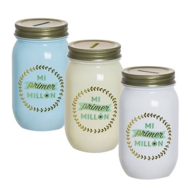 Blue glass piggy bank with "My first million" message in gold and green with leaf detail.