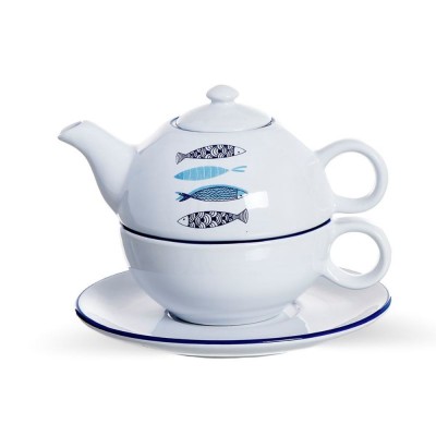 Teapot set with white cup and saucer with blue details and blue fish drawing on the front, Mediterranean style. Collection available.