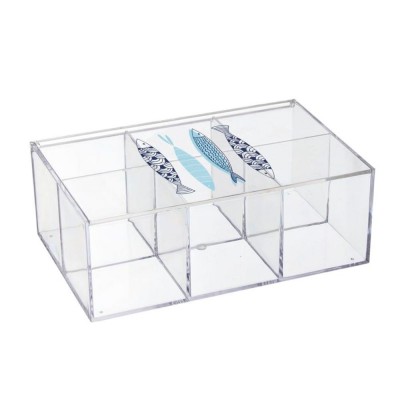 Transparent tea box with blue fish drawing on the lid. Box made up of 6 divisions. Collection available.
