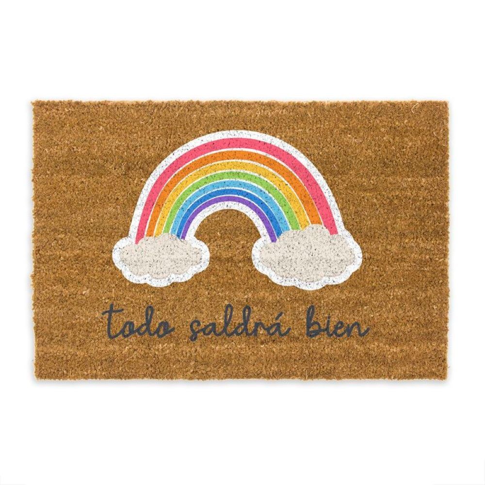 Brown non-slip doormat with rainbow pattern accompanied by the text "Everything will be fine" in black.