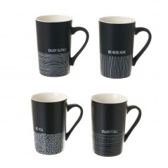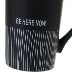 Matte black mug with white vertical line detail and "Be here now" text. Four models and two colors available.