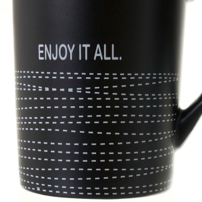 Matte black mug with white dotted line detail and "Enjoy it all" text. Four models and two colors available.