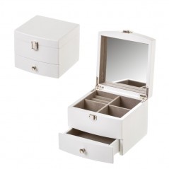 Jewelry box with mirror and drawer. It includes three divisions plus a division for the rings. Metal closure.