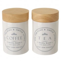 White tea jar with wooden details. Includes circular detail on the front with text: "For the pure & simple living". Tea. Quality brand. New life. Start from everyday. "Collection available.