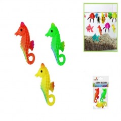 Pack of 3 aquarium decorations in the shape of a seahorse in multiple colors (pink, red, green and yellow).