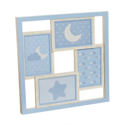 Multiple photo frame consisting of four blue frames with wooden edge. Different models available.