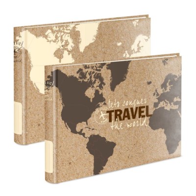 Travel-themed horizontal photo album with world map print with "Let's conquer the world / Travel" message on the center front. Two models available.
