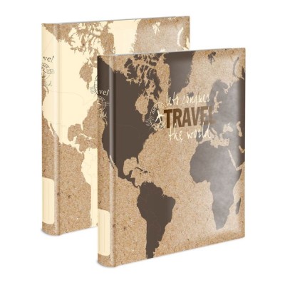 Travel-themed vertical world map print photo album with "Let's conquer the world / Travel" message on the center front. Two models available.