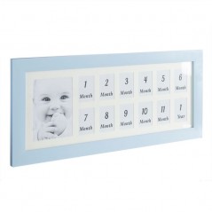 Multiple photo frame that can include twelve photos, one per month. Blue color photo frame with white details.