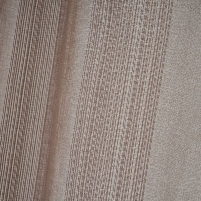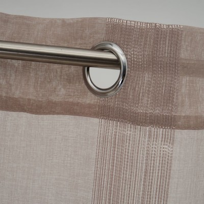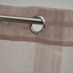 Brown curtain with linear details formed by threads. Curtain made up of 8 chrome rings.