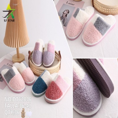 Cotton slippers, good air permeability and good heat resistance. This shoe model is designed for women and decorated with three colours.